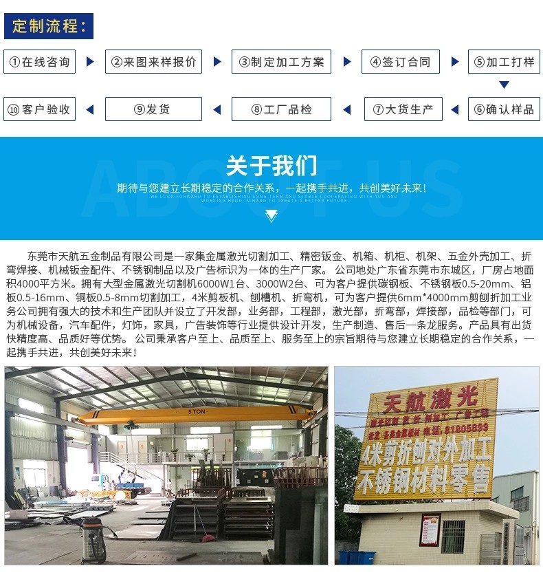 歡迎訪問東莞市天航五金制品有限公司,專業提供東莞鈑金加工、東莞激光加工、金屬激光切割加工、精密鈑金加工、機箱機柜機架、鋁型材機架、標識標牌定制服務!